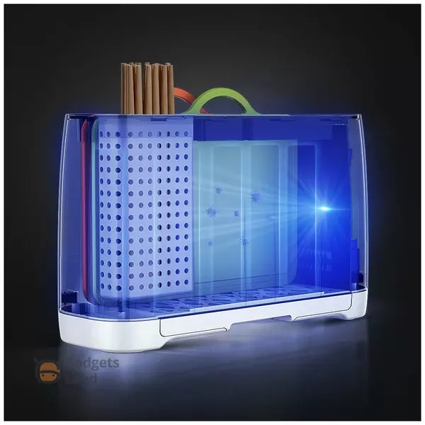 В многофункциональный стерилизатор встроена ультрафиолетовая лампа ближнего действия, которая выдает свечение с длиной волны 254 нм. С ее помощью высушиваются приборы и уничтожается до 99% вредных бактерий. Время полной стерилизации занимает приблизительно пол часа. После обработки ножи, ложки и вилки становятся абсолютно безопасными в использовании. Благодаря небольшим габаритам, подставка с легкостью впишется в интерьер кухни. Стоить отметить, что при компактном размере, изделие отличается внушительной вместительностью! А наличие нескольких отделений, отличающихся по ширине, позволит разместить крупногабаритные ножи и приборы в подставку.